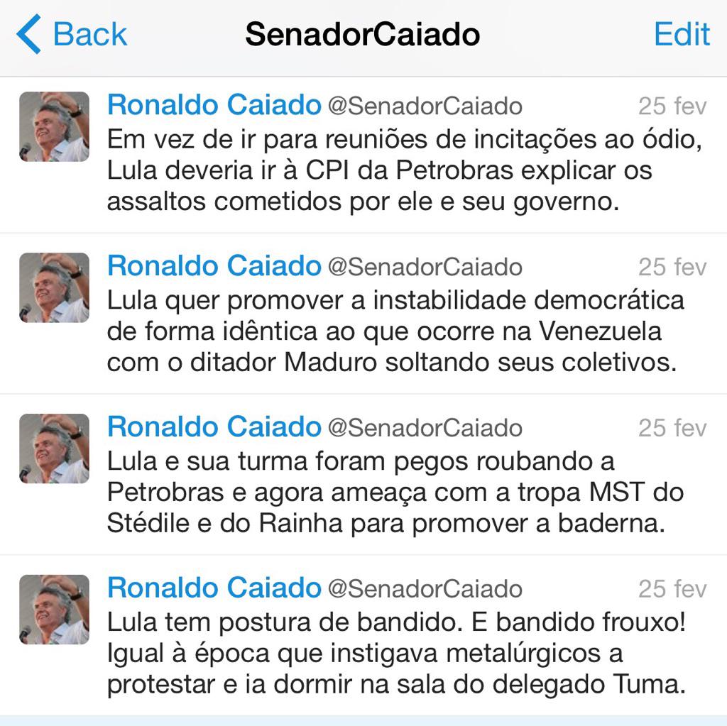 "Ele se viu no direito de ameaçar toda a população brasileira insatisfeita com Dilma Rousseff", disse Caiado. O senador repetiu as críticas que escreveu na ocasião: "Não é comportamento de ex-presidente ameaçar a população, é comportamento de bandido. Ele não é rei".